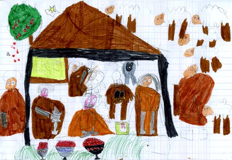 Noua avons dessiné la crèche, c’est la scène qui représente traditionnellement la naissance de Jésus dans une étable. Il y a dans l’étable un âne et un bœuf qui le réchauffent, Joseph et Marie, les parents adoptifs de Jésus, sont à côté de lui. Dehors, les trois rois mages sont venus pour donner des cadeaux à Jésus, ils l’ont trouvé en suivant une étoile qui brillait plus fort, on l’appelle l’étoile du berger (en fait, ce n'est pas une étoile, mais c'est la planète Vénus, et elle brille beaucoup car elle est très proche de nous par rapport aux étoiles, plus grosses mais beaucoup plus lointaines). Elle brille au dessus de l’étable. Un berger et ses moutons sont souvent représentés à côté de l’étable, le berger est venu aussi voir le nouveau né.